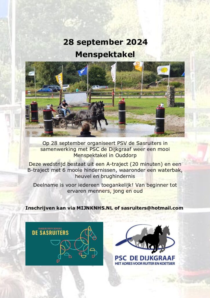 Op Zaterdag 28 september a.s. organiseren we in samenwerking met de SAS ruiters en Stichting Vierspan Zuid Holland het inmiddels beroemde Menspektakel! Schrijf je alvast in of zet het in de agenda om gezellig een dagje te komen kijken!